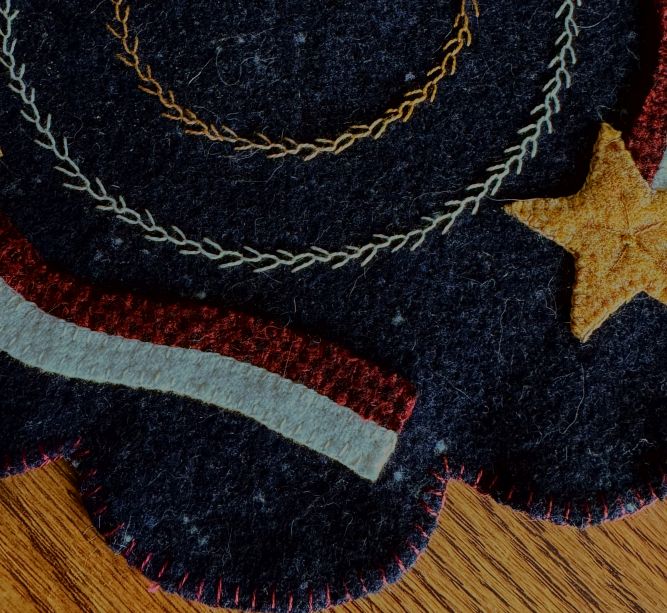 Patriotic pieces fit in anyone’s home and this mat is no exception. Simple yet elegant, it can shine all year long. The navy background is the perfect background for the burgundy and cream waving banners and gold stars. The mat is hand stitched with 100% wool fabrics.