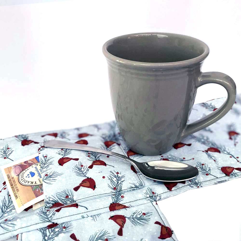 Mugs have always been a favorite gift for the holidays. That special gift that had the perfect picture or special message on it. Now you can add to that special gift with a caddy that, when untied, doubles as a mug rug. The caddy has a wrap that holds the mug in place for travel, a pocket for a spoon, and another pocket to hold a tea bag, coffee or cocoa mixture, other drink mixes, or sweeteners. The sturdy grommets make carrying your mug to meetings, group events, or just funky storage on your favorite student’s desk. Tuck a cookie under the mug or a gift card and you have the perfect gift for a grandparent, teacher, or college student. These also make perfect Secret Santa, work exchange gifts, or a donation to a fundraising raffle event.