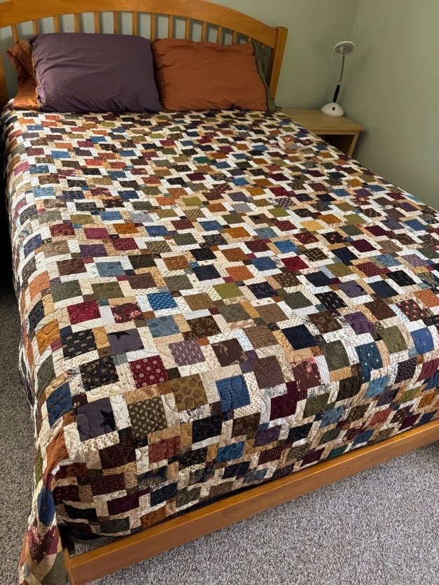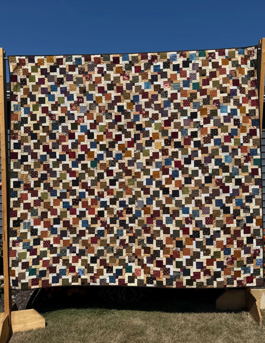 This quilt is a version of a disappearing 9-patch. Randomly stitch together 9-patch blocks, do a little cross cutting and a whole new block emerges! It’s a very fun technique and always a surprise when you put your blocks back together.